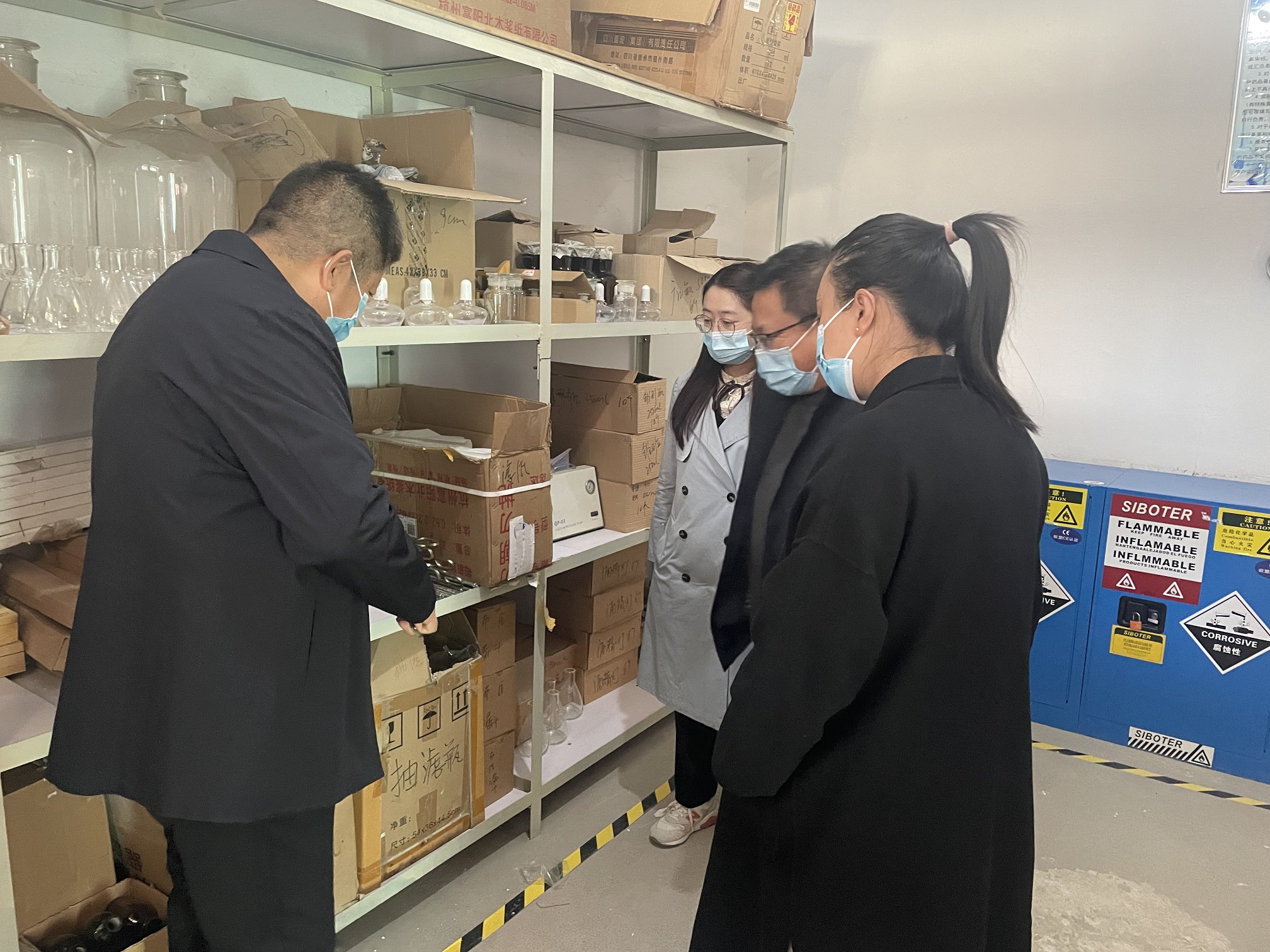 白锦川一行首先到必赢网址bwi437实验实训药品仓库进行检查,查看了化学品台账、消防设施、通风设施、监控和报警设施,重点对危险化学品管理、安全管理制度与操作规范的落实情况等进行了细致检查;接着一行人来到工科实训中心,依次进入每个实验室,对实验仪器设备、实验记录、实验安全措施等进行全面细致的检查。针对此次检查存在的安全隐患做好记录工作,并提出改进措施。