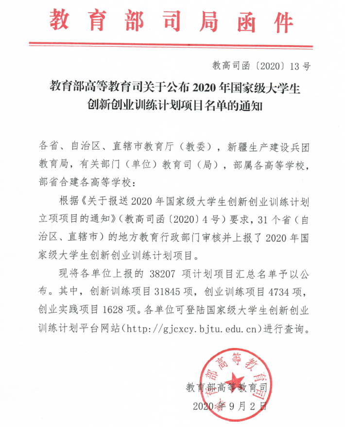 教育部高等教育司关于公布2020年国家级大学生创新创业训练计划项目名单的通知