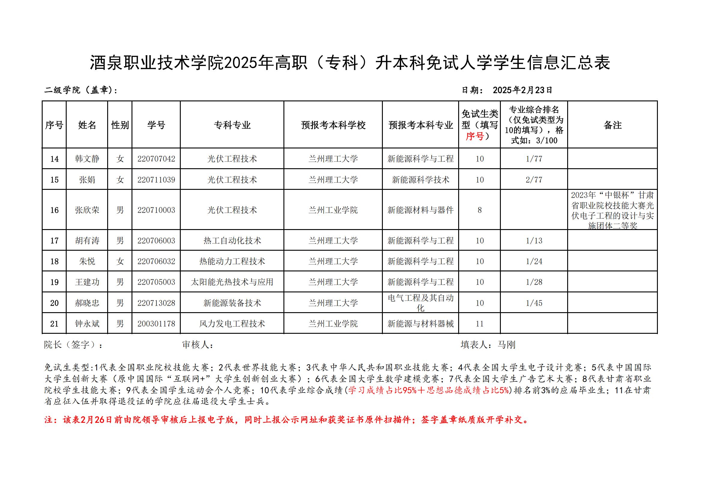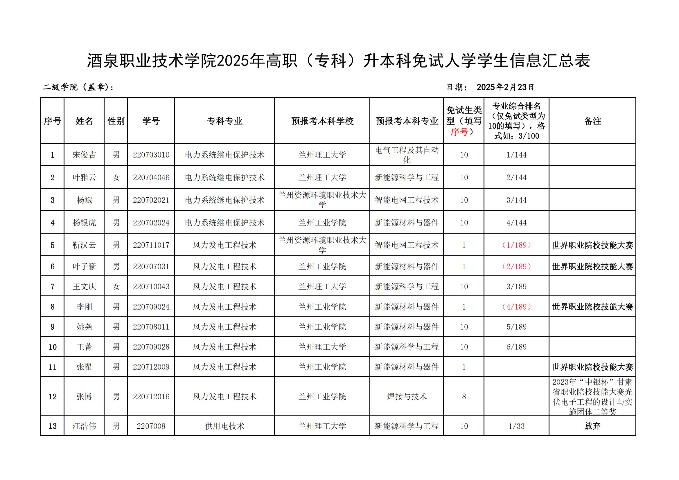根据《2025年甘肃省普通高校高职(专科)升本科免试招生工作实施方案》《必赢网址bwi4372025年高职(专科)升本科考试免试入学考生资格审定办法》的文件精神。按照学生个人申请,各班级推荐,学院审核的程序,本着公平、公正、公开的原则现将我院符合免试生资格学生名单予以公示(详细名单见下表):